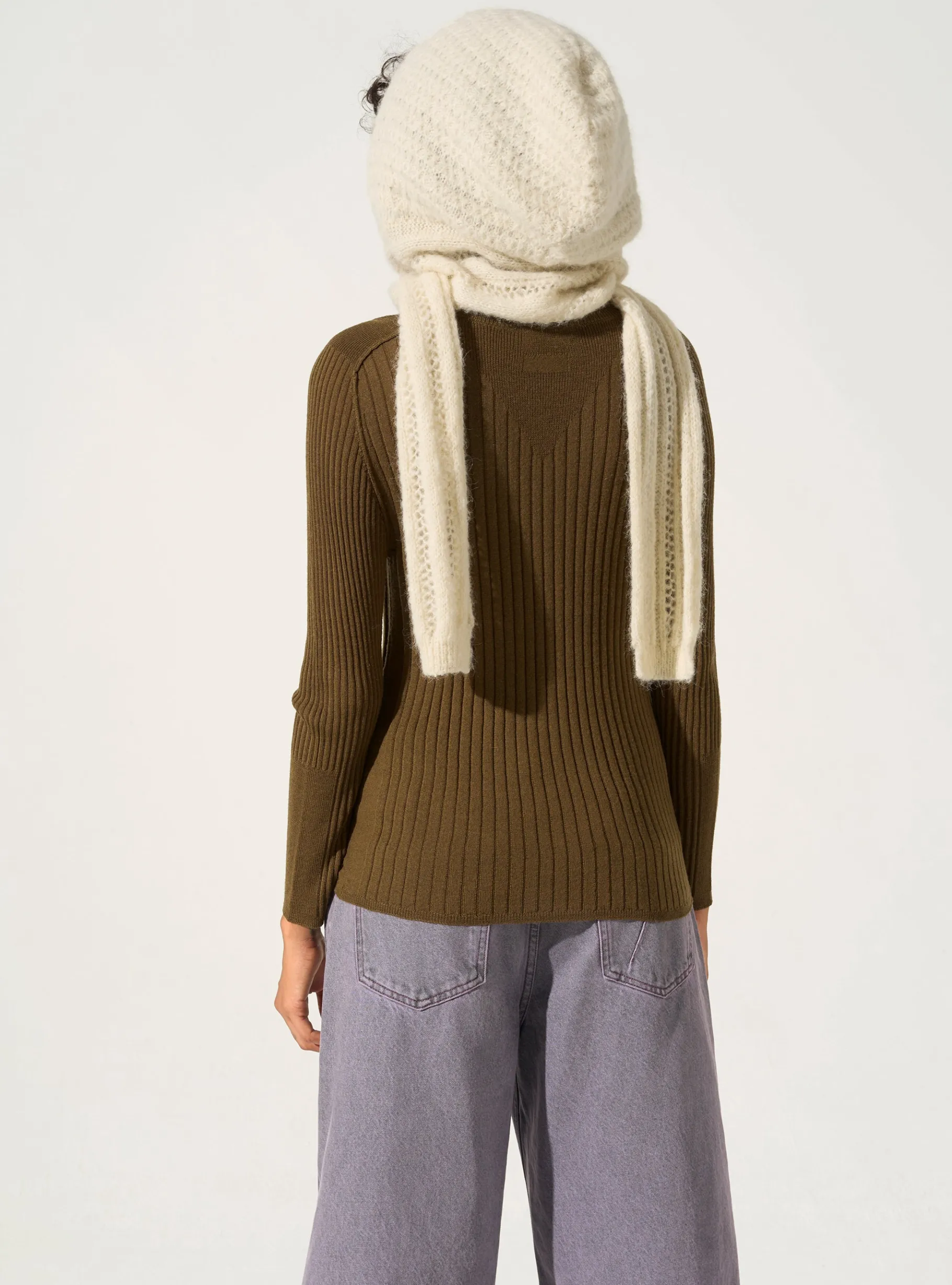 Pièce double emploi bonnet-écharpe esprit cagoule, resserrée par des côtes autour du visage.