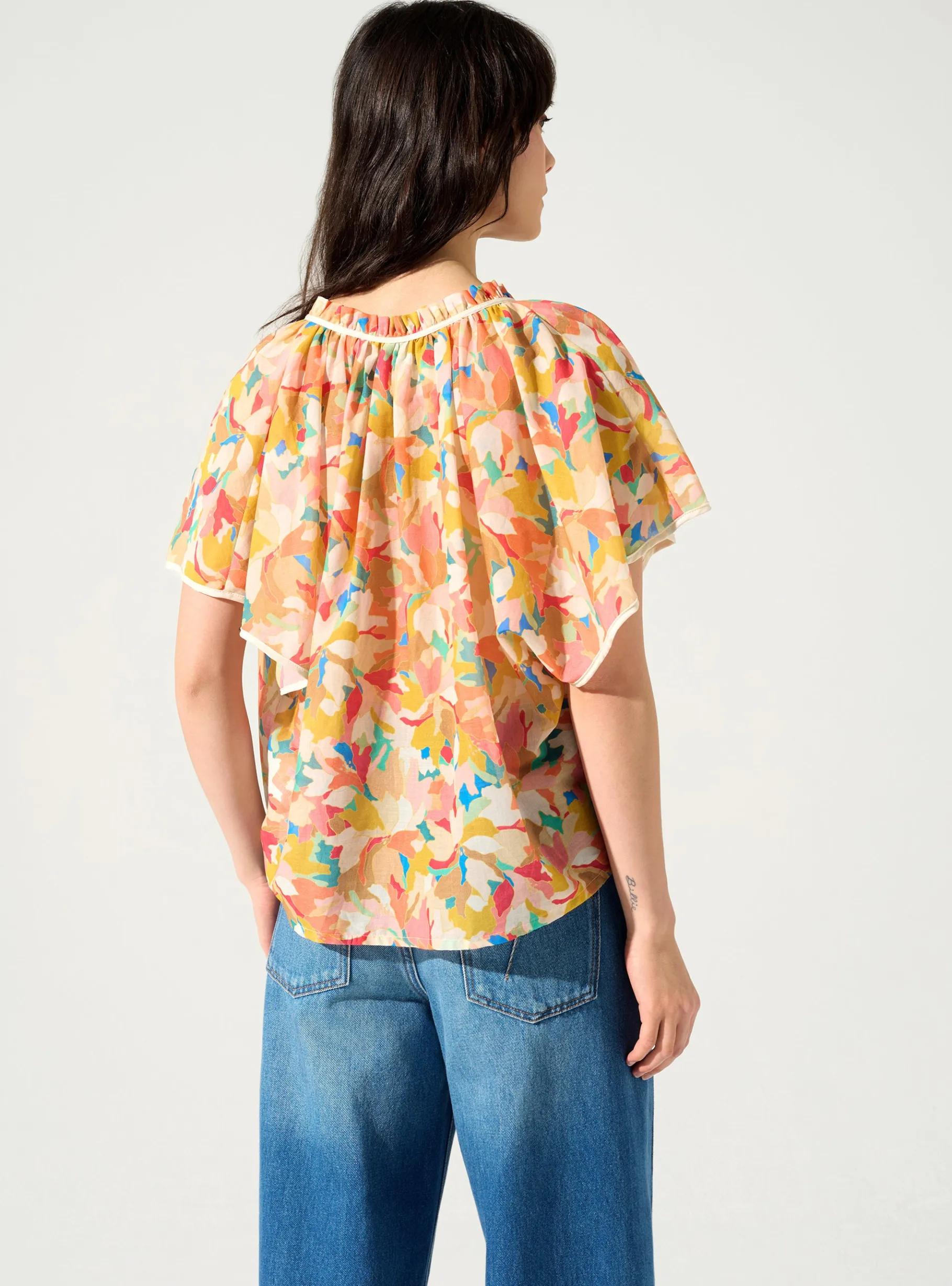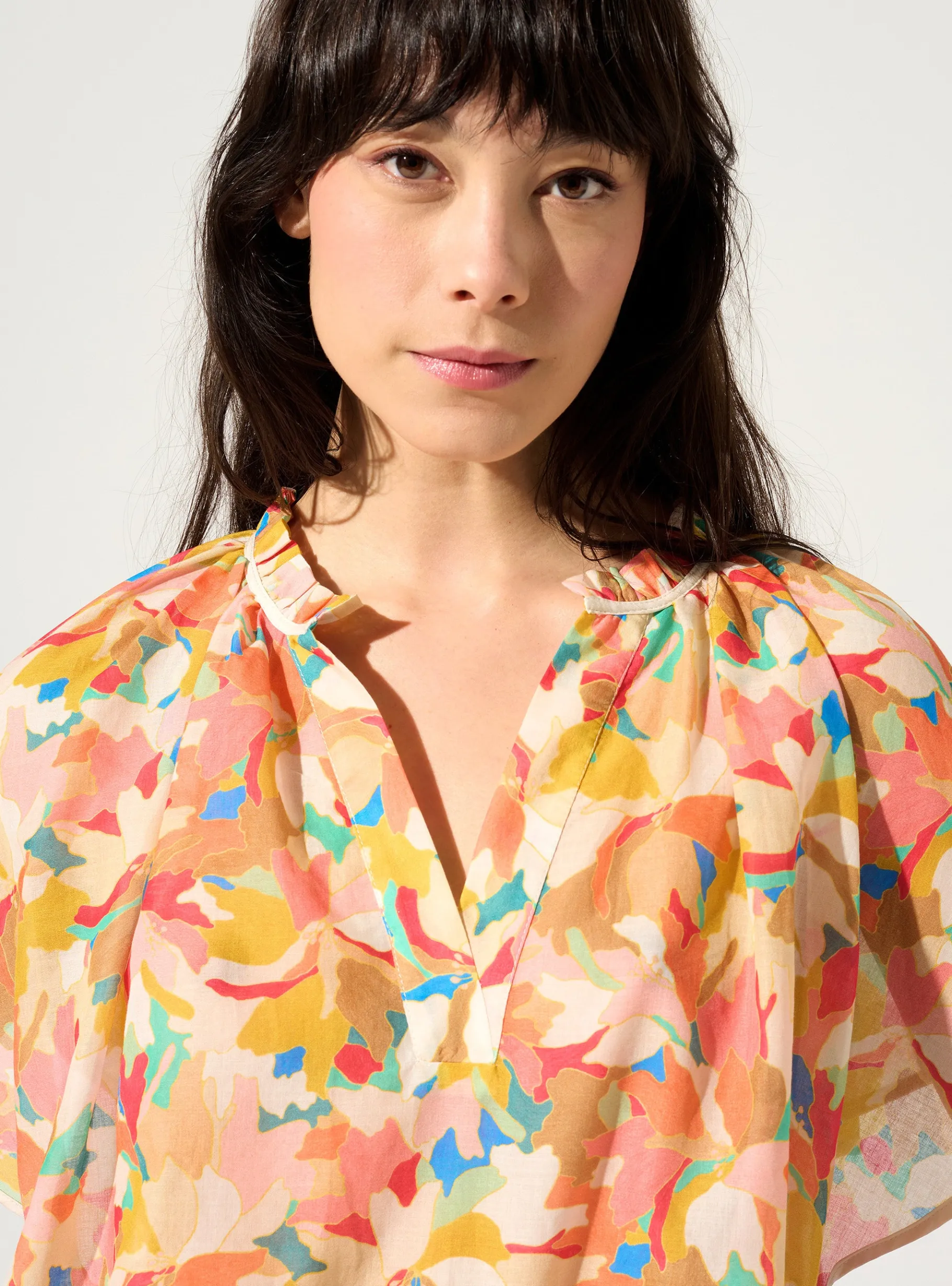 Blouse à la coupe oversized et aux manches courtes avec un col en V plongeant. Vous aimerez ses détails : les plis à l’encolure ainsi que le biais contrasté pour la finition bas de manche et à l’encolure. Pièce idéale pour les beaux jours grâce à l’imprimé exclusif « Bloom » décliné dans une variante lumineuse sur un voile de coton léger.